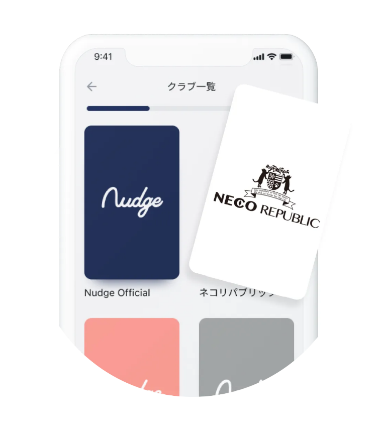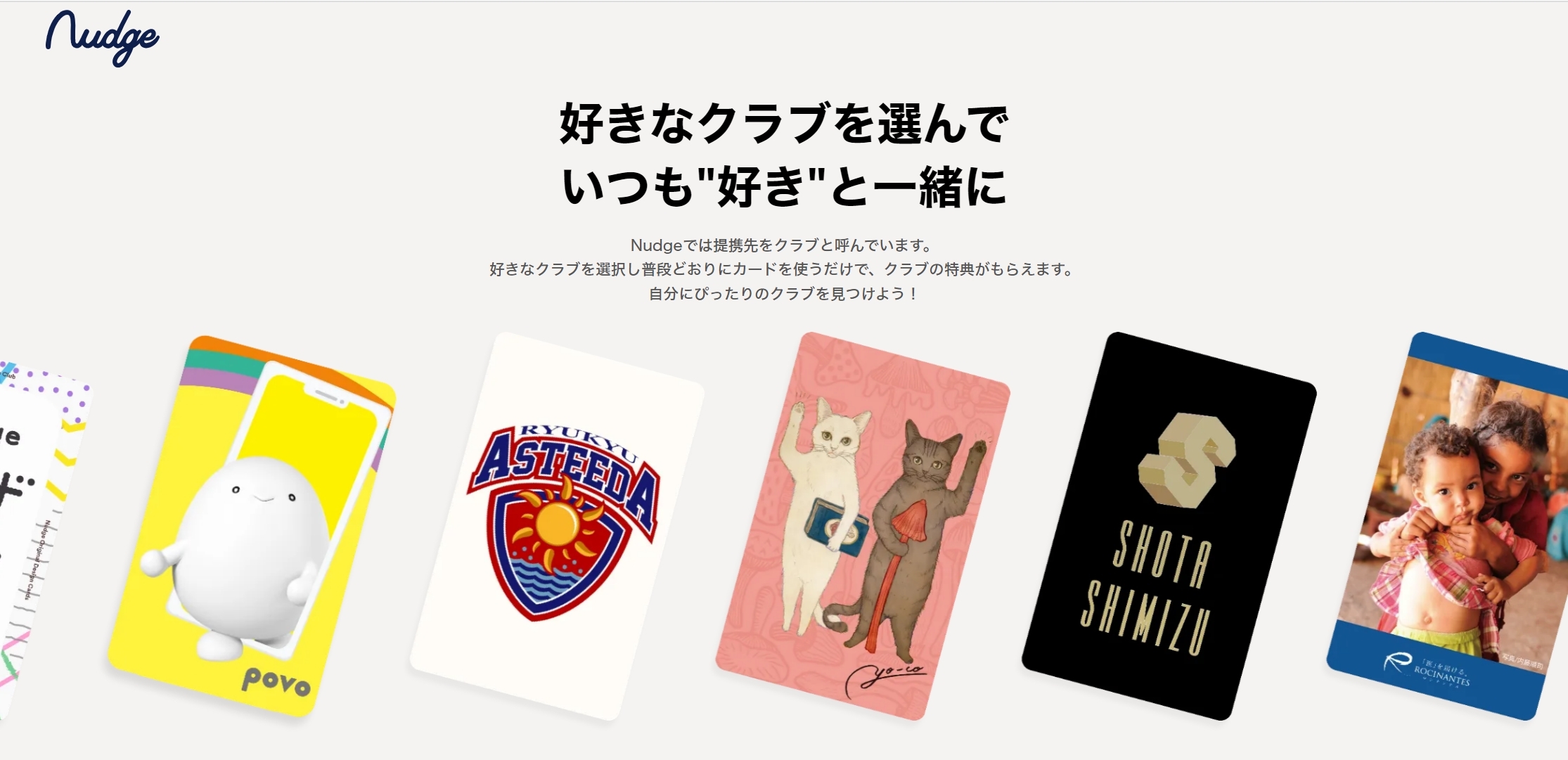 Nudgeが提携している芸能人、ショップ、アーティストや団体などから好きなクラブを選択し、ショッピングでカードを使うと利用金額に応じてクラブの限定特典がもらえます。