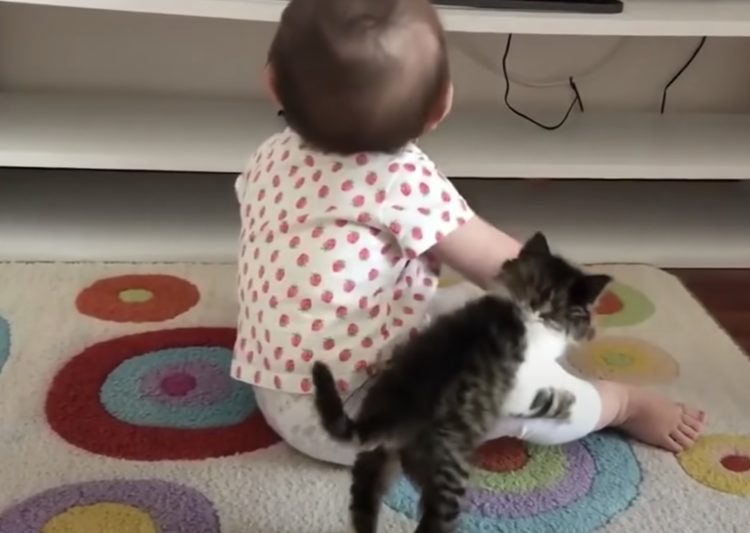 赤ちゃんの足に飛びかかったり甘噛みしている子猫。