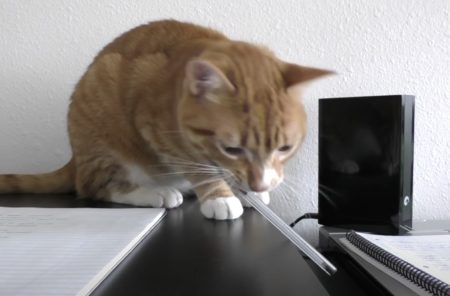 その姿の怪しさに、逆に猫の興味を引いています。