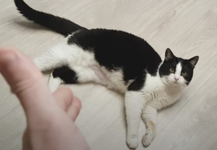 「撃たれたフリですね、ハイ」飼い主さんの遊びに渋々付き合う猫さん。