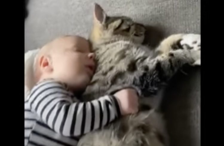 寝ている猫さんに赤ちゃんが抱きついているのか、