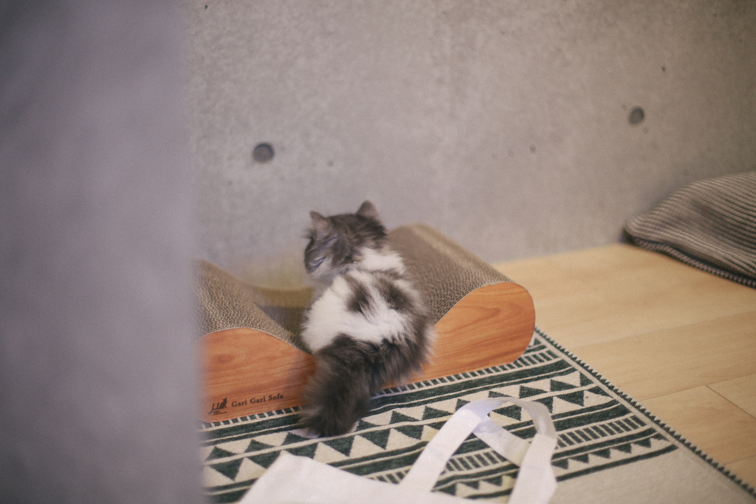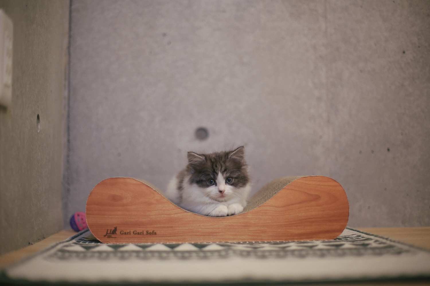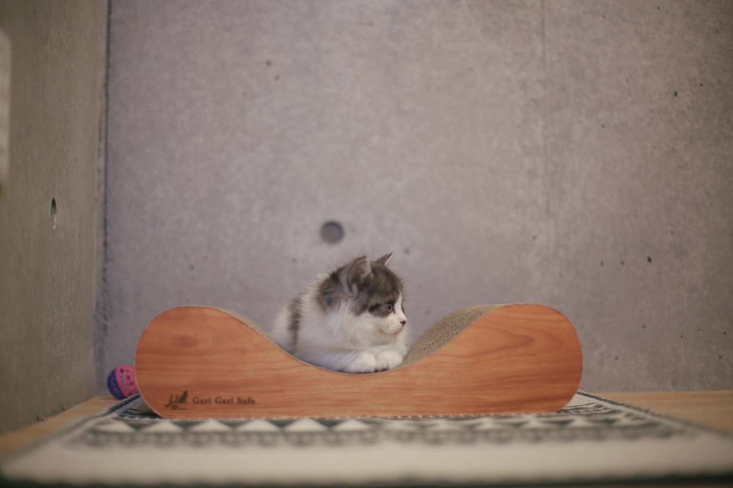 この爪とぎ「ミュー (mju:) ガリガリソファインテリアミニ」のおすすめポイントは、ねこがくつろげるデザインというポイントのほかに、サイズが2種類あるところ。たそはまだ子猫なのですが、子猫には今回ご紹介したミニを。成長して成猫になると、レギュラーサイズに買い換えることで体のサイズにあったものを使うことができます。