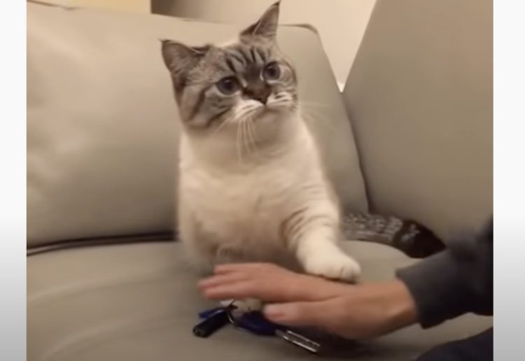 行かにゃいで…鍵を持った飼い主の手を、そっと止める猫。