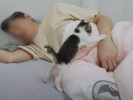 眠っていた子猫さんに気づいた飼い主さん。