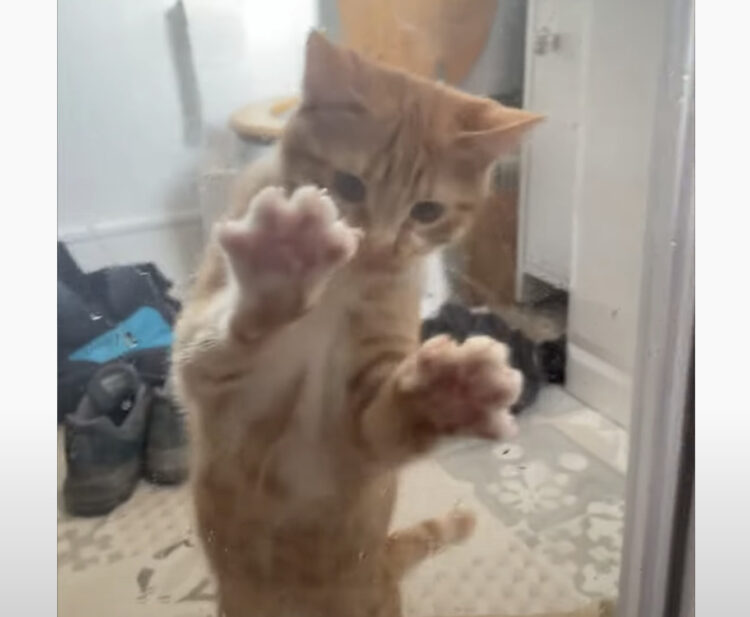 ガラスに貼り付いている茶トラの猫さん。