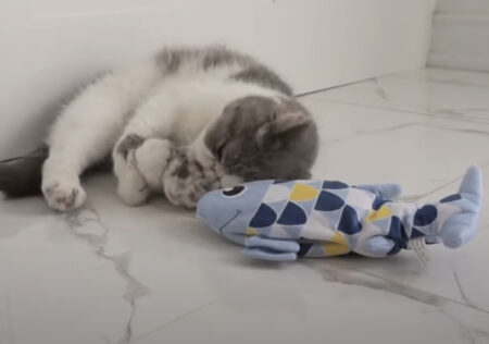 ピチピチと動くお魚のおもちゃの隣でゴロゴロ♪