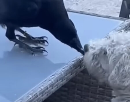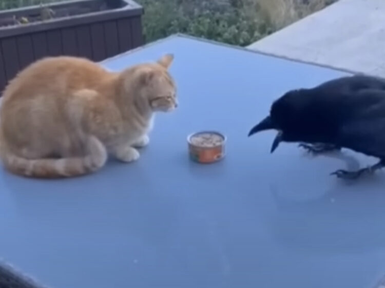 猫さんのエサをカラスが横取り!? と思ったら犬もやって来て…