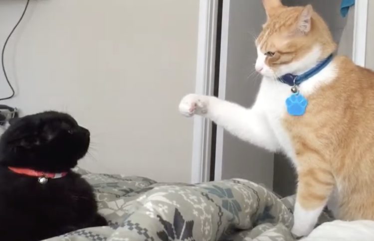 場所を譲らないなら猫パンチだぞ!というところかな?