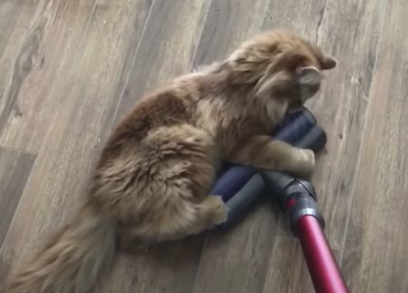 掃除機をかけていると、ガシッと捕まってくる猫さん。