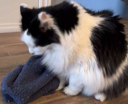 お気に入りを独り占め! ブランケットをずるずる運ぶ猫さんが可愛いい〜♪