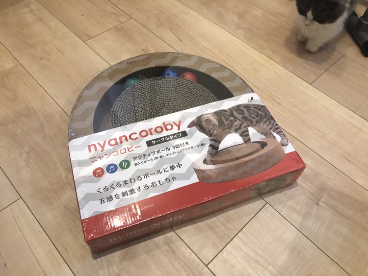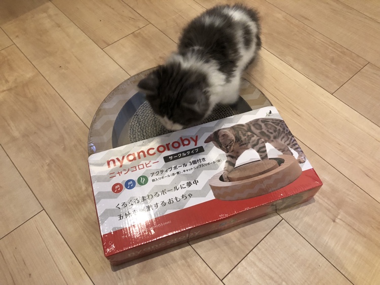 ニャンコロビーが届きました。今回はAmazonで購入。たそくん、早速気になっているご様子。遠くから様子を伺っていますね。