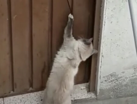 猫さんが紐を引っ張りながら、