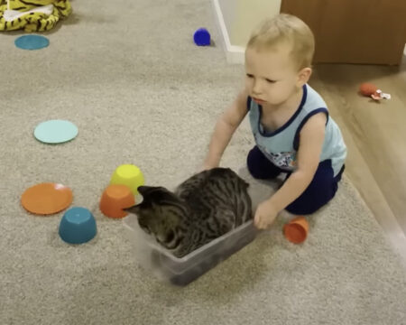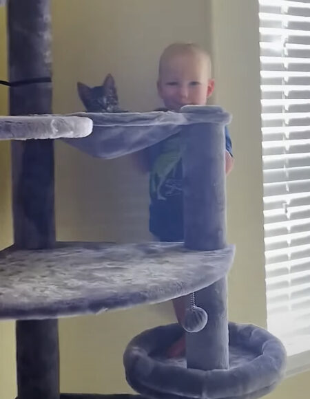 キャットタワーにも一緒に入りたいけど、