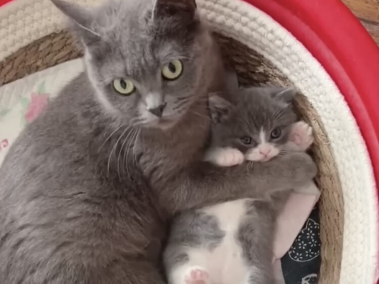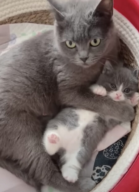 こちらの親子は、ヘソ天の子猫を