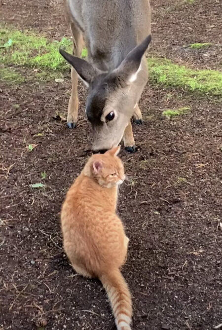 とっても社交的な猫! 鹿に毛づくろいをおねだり♪
