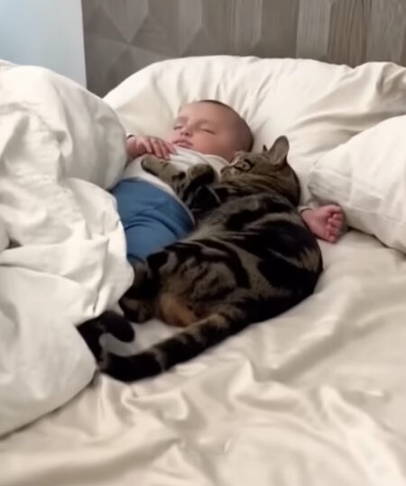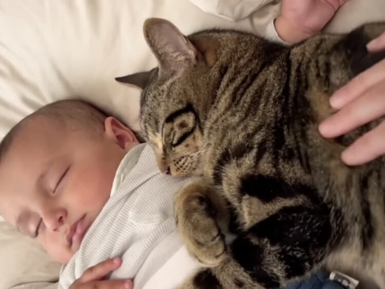 赤ちゃんのそばにいたがる猫さん、