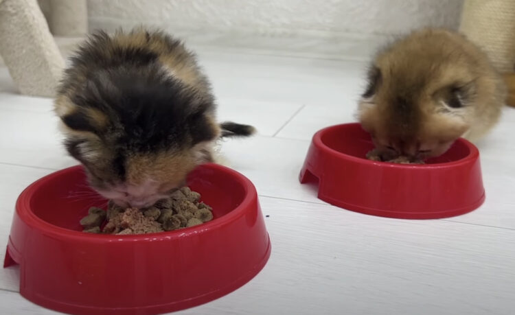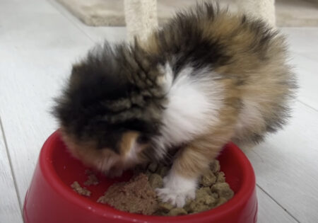 落ち着いて食事する子猫さんと