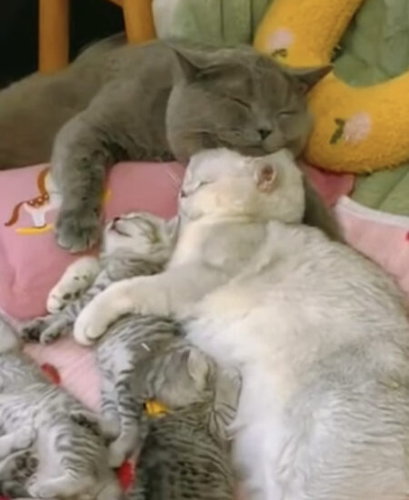 子猫をぎゅーっと出しきめながら寝るママ猫さん。