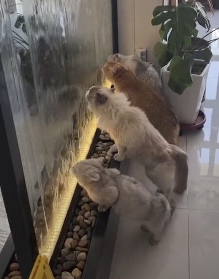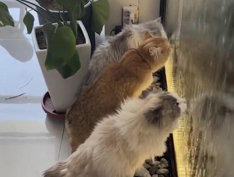 流れる水に集まってくる猫さん達。ウォーターカーテンって飲めるの?