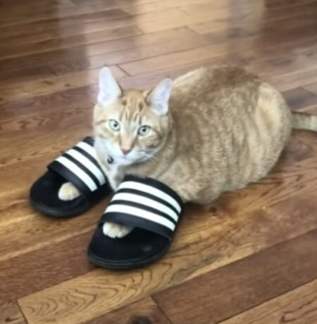 飼い主のサンダルに興味があった猫、使っていない時こっそり履いてみた!