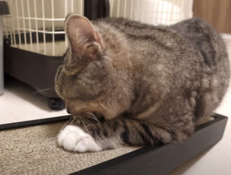 飼い主さんが爪とぎを横にしてくれるまで