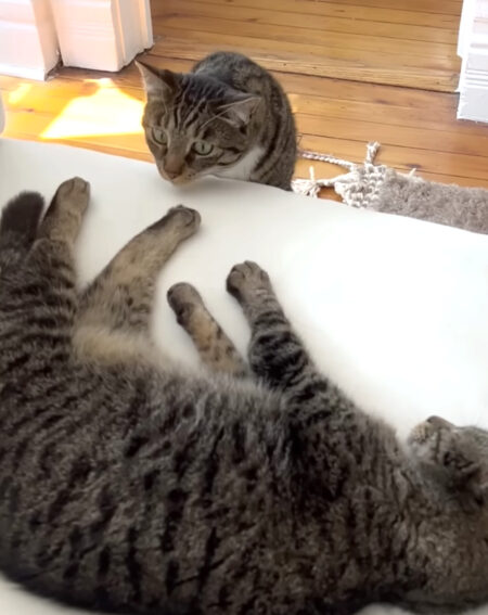 知らない匂いで保護猫さんの存在に気づいたようで、