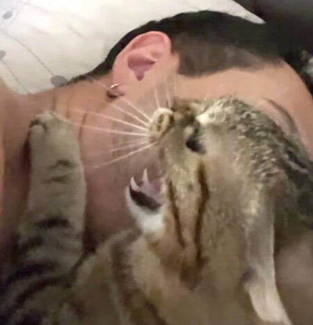 男性の飼い主さんとぎゅーっとくっつき合いながら、