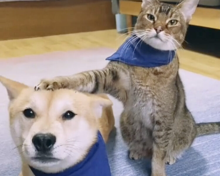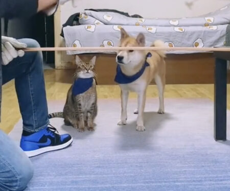 お手本を見せてやるニャ! 同居犬と一緒に芸を披露する猫。