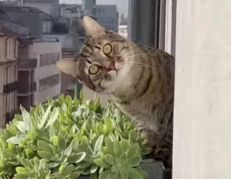 首をかしげながらこちらを見ているのは
