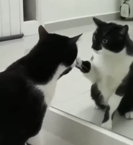 鏡の中の猫にびっくりして