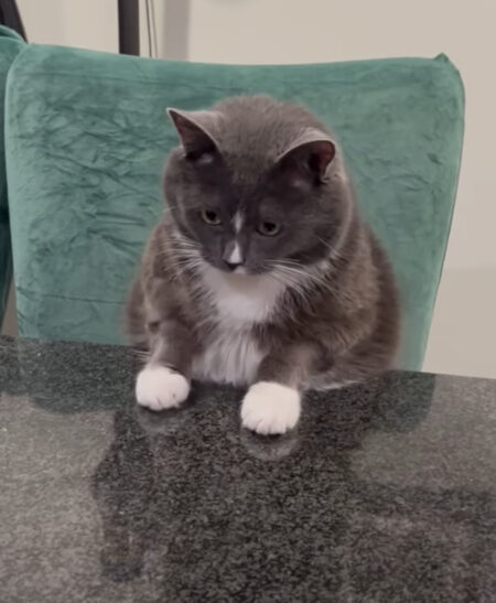 椅子に腰掛けて、テーブルに手を揃える姿が