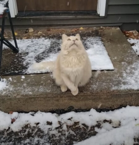 こちらの猫さんは、空から降ってきた雪に興味津々!