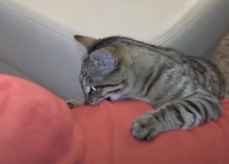 洋服にかみついたり、ぎゅーっと手に力を入れて、