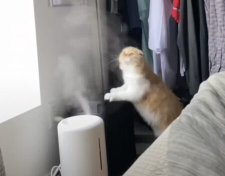 蒸気と戦っているモフモフの猫ちゃんを見て