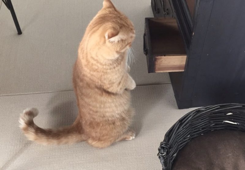 器用に引き出しを開けるマンチカンのウニさん。
