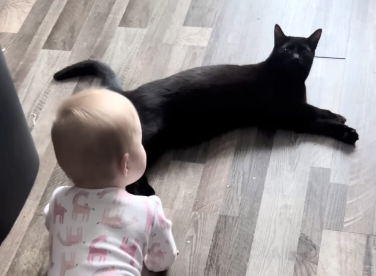 赤ちゃんと黒猫ちゃんのヒソヒソ話?可愛らしいやりとり♪