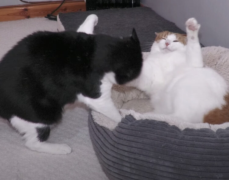 両手を挙げて精一杯の威嚇! ベッドを取り合ってケンカする猫。
