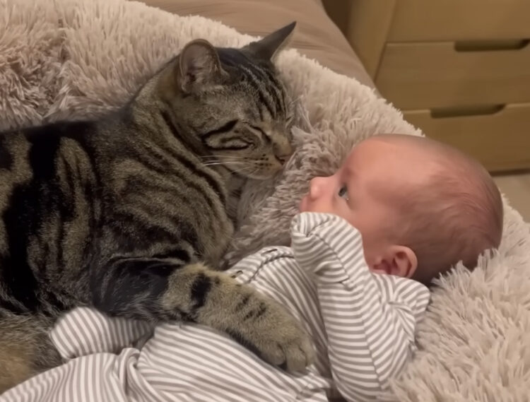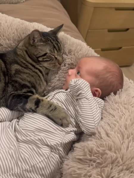 寝かしつける気だったけど… 赤ちゃんより先に寝落ちしちゃった猫さん♡