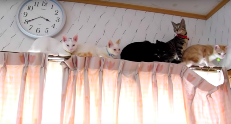 定員オーバーです!カーテンレールの上で…