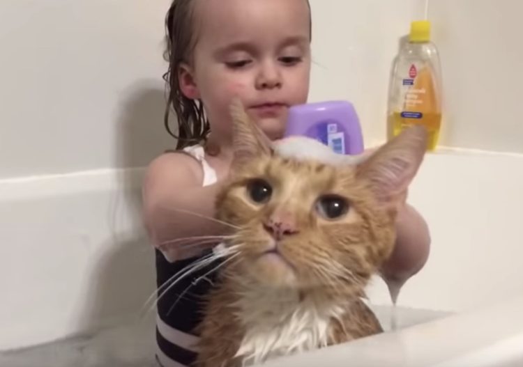 子供に付き合う優しい猫さん。「しょうがないニャ。一緒にお風呂も入ってあげる!」