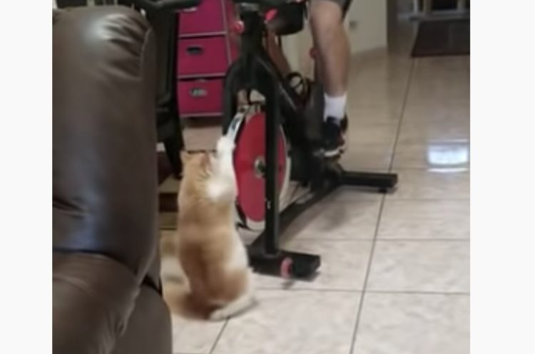 こちらのお宅の猫さんは飼い主さんがフィットネスバイクを使用していると、