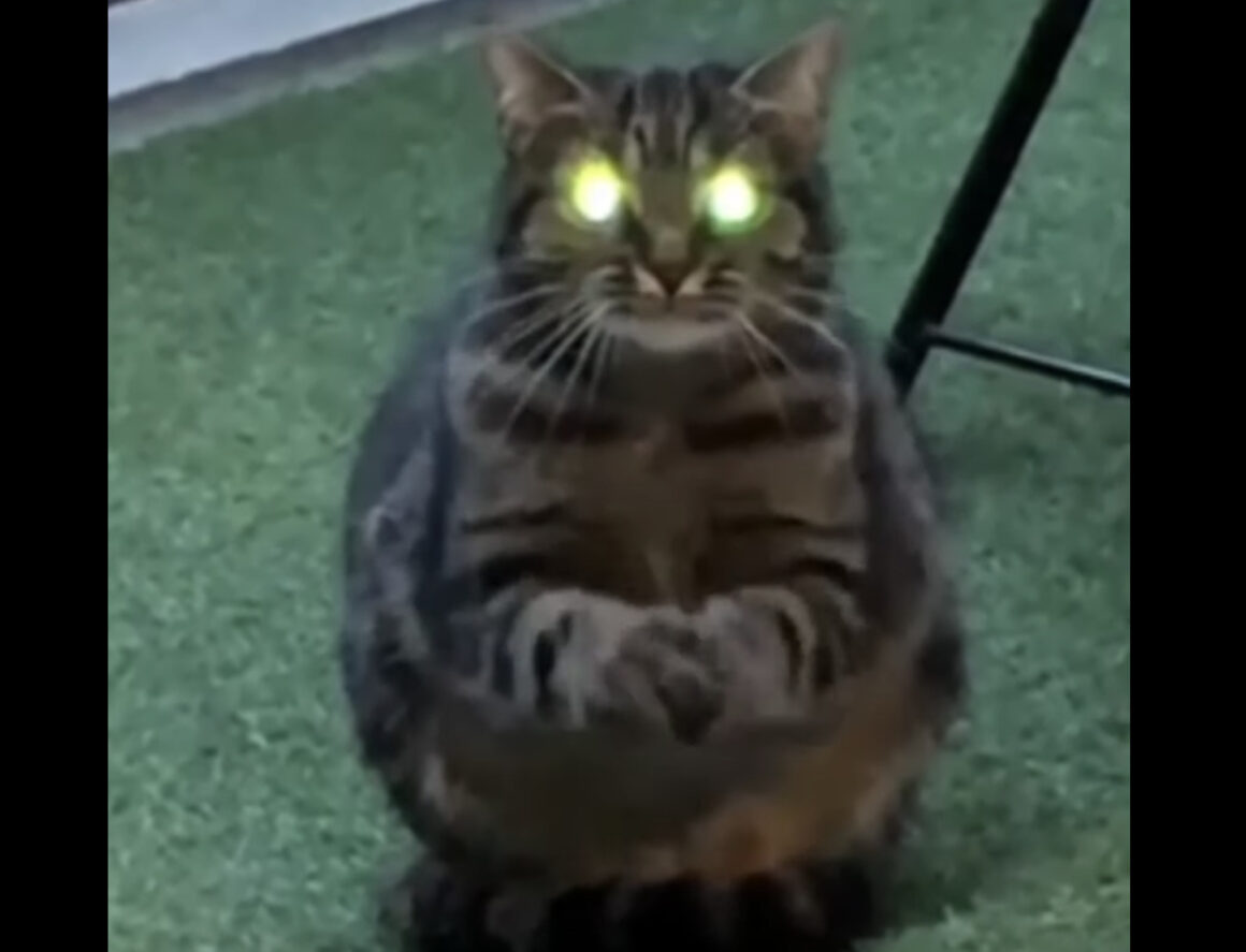 お外で撮影者さんに向かって 両手を合わせながら、 可愛らしく「お願い、お願い」のポーズをしている猫さん。 家の中に入れてほしいのかな? 手を合わせているそのポーズ、 とっても可愛いらしいのですが... 気になるのは猫さんの目!! キラーンと光って... -
