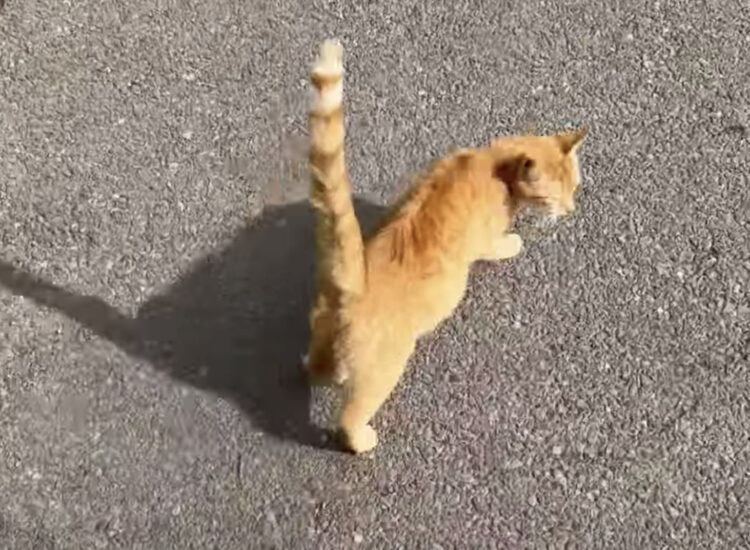 男性の前を歩いているのは、 近所の茶トラの猫さん。 男性の姿を見ると駆け寄って来て、 前を歩きはじめたそうです。 時々後ろを振り返りながら 猫「ちゃんとついて来てね!」と どこかに案内してくれているみたい? 尻尾をピンっ!と伸ばした様子は、 人... -