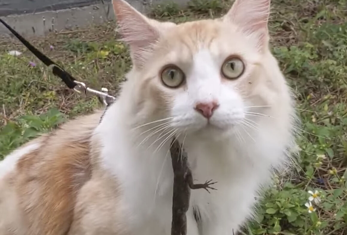 飼い主さんと一緒に お散歩にやってきた猫さん♪ 家とは違って土の匂い、芝生の上、 歩いているだけで楽しいものです♪ 家族でお散歩を楽しんでいましたが 飼い主さんが猫さんの顔を見てびっくり!! 何かくっついていると思ったら...トカゲ!? のんびりした性... -