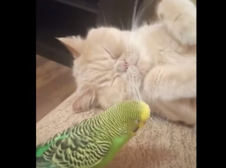 寝ている間に綺麗にしてあげる! 鳥に毛づくろいしてもらう猫。