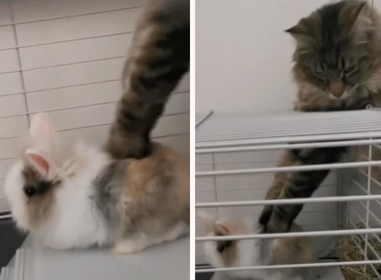どうしてもウサギに触りたかった猫、ケージの隙間からそっーと。