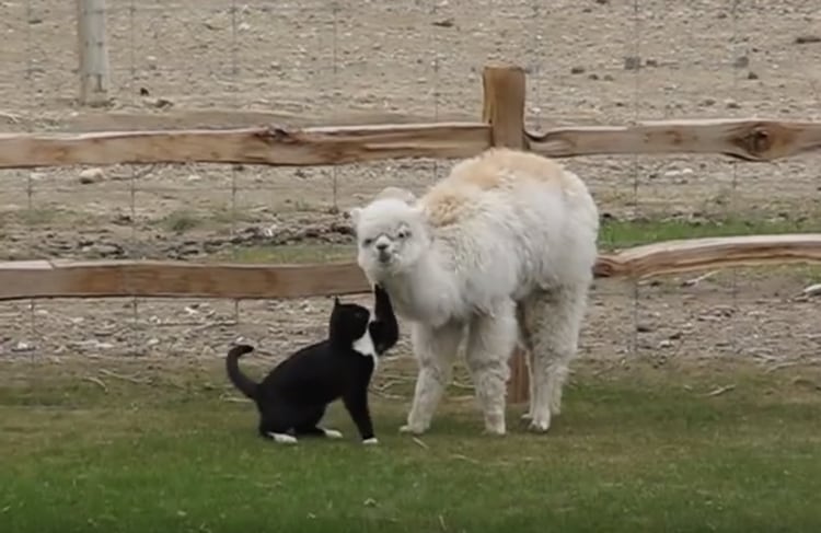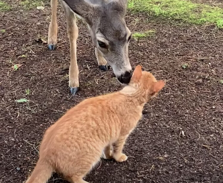 とっても社交的な猫! 鹿に毛づくろいをおねだり♪