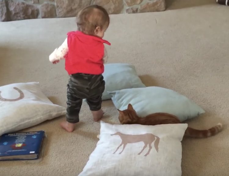 ヨタヨタと歩く赤ちゃん。 まだ歩けるようになったばかりかな。 そこに猫さんがやってきて、 あ、危ない!よろけた赤ちゃんが バランスを崩して猫さんの上に倒れそう! 猫さんがつぶされちゃうー! と思ったら、、、 素晴らしい運動神経発揮! ビョーンと... -