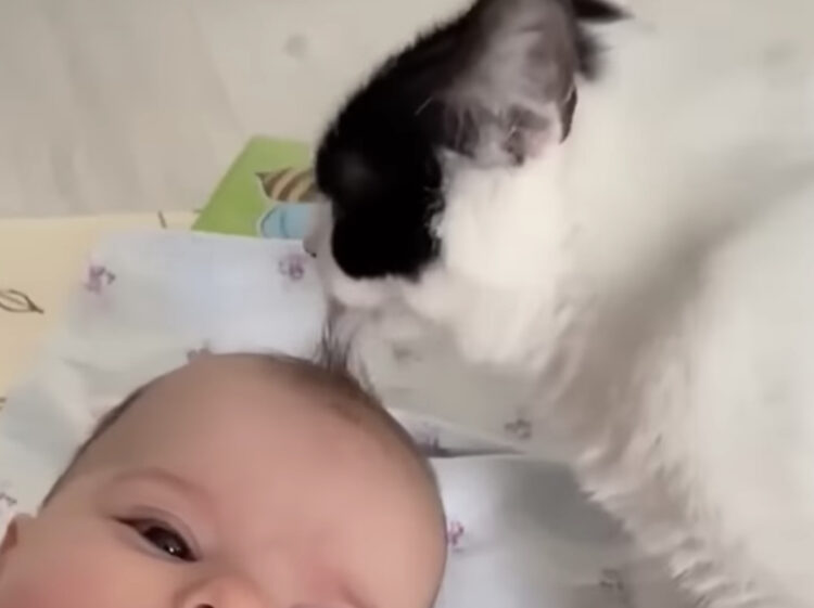 赤ちゃんのお世話をしたがる猫が可愛い♡