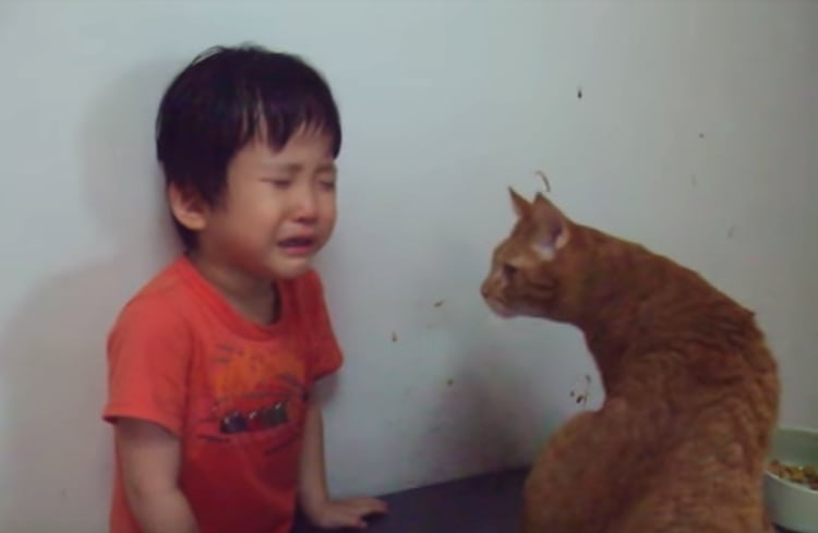 「泣くにゃよ、元気出して?」泣いてる男の子をなぐさめてあげる猫。